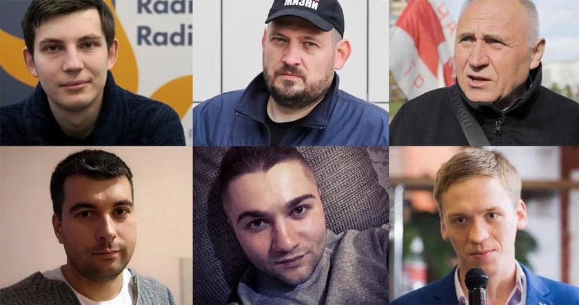 U śpisie — palitviaźni Ihar Łosik, Dźmitryj Papoŭ, Arciom Sakaŭ, Mikoła Statkievič, Siarhiej Cichanoŭski i Uładzimir Cyhanovič, jakija byli asudžanyja na zakrytym pracesie ŭ budynku SIZA-3 ŭ Homieli 14 śniežnia 2021 hoda.