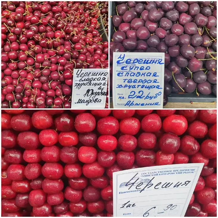 Niedarahuju čarešniu znajšli za 6,9 rub. za 1 kh, jahady z Małdovy. Samuju darahuju — za 22 rub. Paznačajecca, što jahady prybyli z Armienii i što jany vielmi sałodkija i chrabustkija. U asnoŭnym ža cana na hetyja jahady — kala 8-10 rub. za kh.