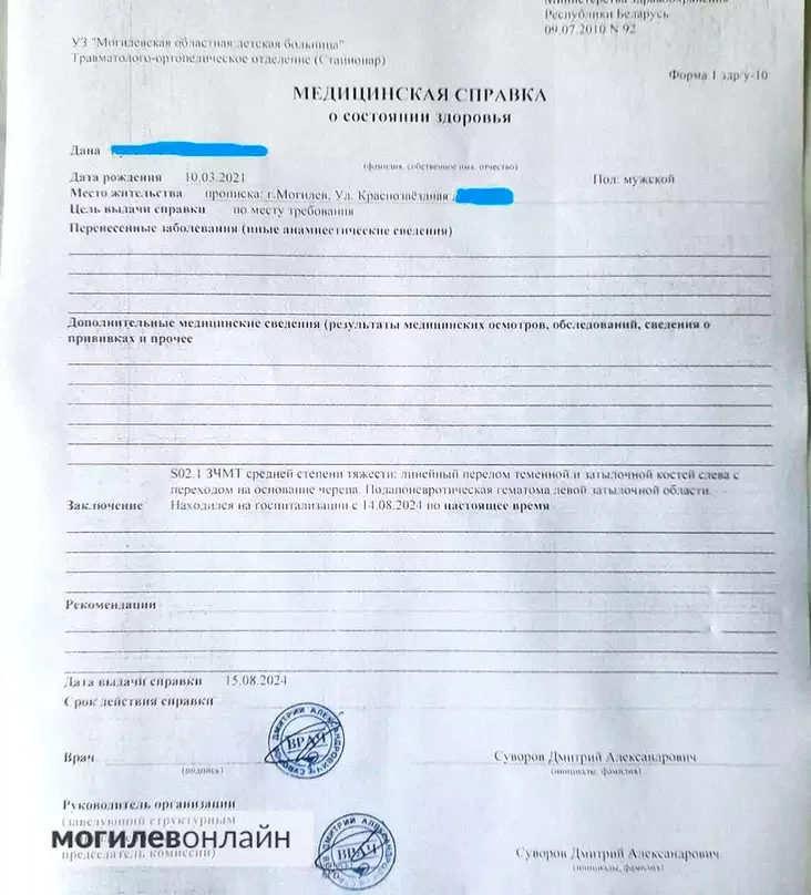 U vyniku padzieńnia dzicia atrymała surjoznyja traŭmy: pierałomy ciemiannoj i patyličnaj kostak ź pierachodam na asnovu čerapa. Chłopčyka pakłali ŭ balnicu.