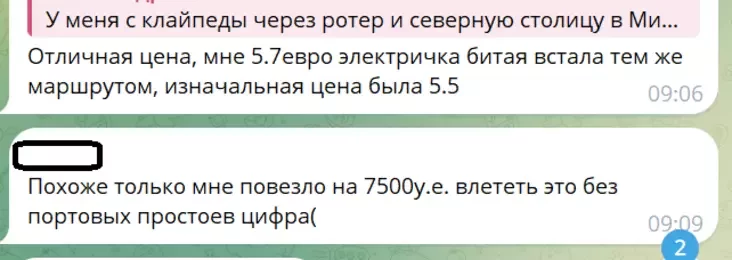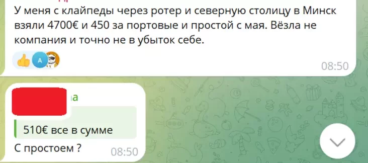 U telehram-čacie, jaki abjadnoŭvaje aŭtaamataraŭ, čyja technika zachrasła ŭ Kłajpiedzie, naličvajecca bolš za try tysiačy ŭdzielnikaŭ. Siarod ich jość jak tyja, chto tolki čakaje adpraŭki, tak i tyja, čyja technika znachodzicca na šlachu abo ŭžo dabrałasia da Minska. Apošnija dzielacca, kolki zapłacili za dastaŭku alternatyŭnym šlacham.
