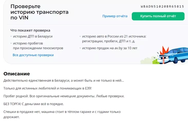 «Tolki dla sapraŭdnych amataraŭ, jakija razumiejuć u Je39! Prabieh rodny. Usie aryhinalnyja niamieckija dakumienty. Lubyja pravierki. Biez torhu! Z hrašyma ŭsio ŭ paradku. Śpieški ŭ prodažy niama, mašyna staić u ciopłym haražy i z hadami tolki daražeje», — havorycca ŭ apisańni.