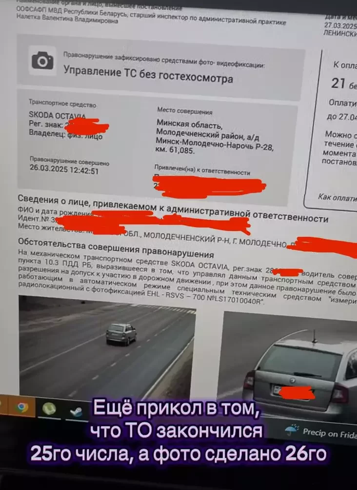 Błohier pakazaŭ, jak atrymaŭ štraf za adsutnaść techahladu z kamiery na maładziečanskaj trasie.