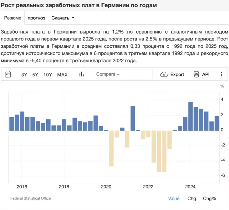 A voś siaredniestatystyčny niemiec, naadvarot, u žniŭni 2019‑ha moh dazvolić sabie bolš, čym ciapier, pakolki ŭzrovień inflacyi ŭ Hiermanii za hety pieryjad byŭ bolš vysokim za rost zarpłat. U siarednim realnyja zarobki ŭ Hiermanii za apošnija 6 hadoŭ źmienšylisia pryblizna na 5%.