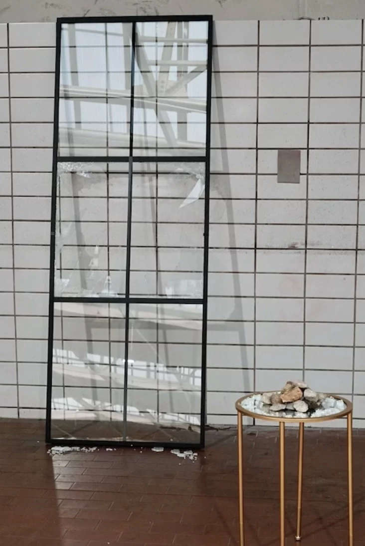 Na bierlinskaj vystavie Spit on H*tler’s Grave rasijski mastak źniščyŭ pracu biełaruskaj mastački Aleny Rabkinaj, niekalki razoŭ kinuŭšy kamieńnie ŭ art-abjekt, zrobleny z zahartavanaha škła.