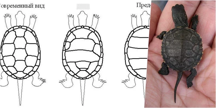 «Adnojčy na palancy ja ŭbačyŭ čarapašania, jakoje tolki vybrałasia z hniezdavoj kamiery. U vočy adrazu kinułasia niezvyčajnaje raźmiaščeńnie ščytkoŭ na pancyry: rebiernyja abjadnanyja z chrybietnym u adzin ščytok, jaki apiarezvaje. Paźniej ja razhladzieŭ, što na troch kaniečnaściach brakuje pa adnym palcu.