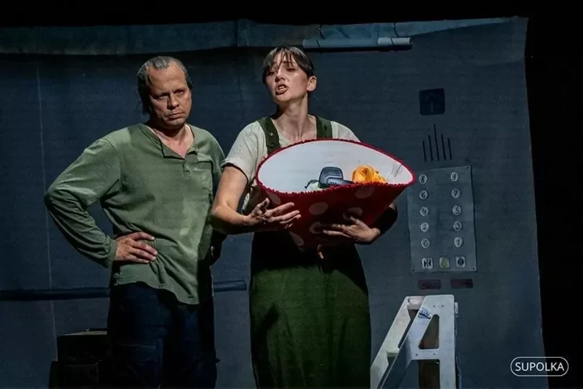 Na «scenie» — pamiaškańnie dla pakazaŭ śpiecyjalna nie prystasavanaje, ale vykarystoŭvacca dobra, — dva akciory: Aleksandr Jendžyjeŭski i Nastaśsia Suchanosik. Ich hieroi zachrasajuć ŭ lifcie i ŭ čakańni dapamohi pačynajuć razyhryvać historyi, pieraŭvasablajučysia ŭ samych raznastajnych hieroŭ. Heta zroblena vynachodliva i aryhinalna.