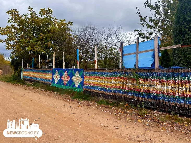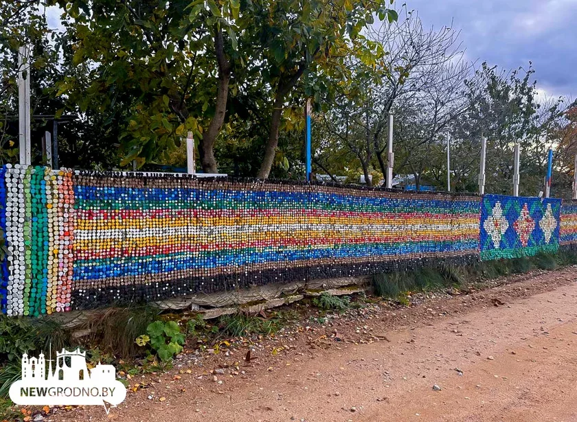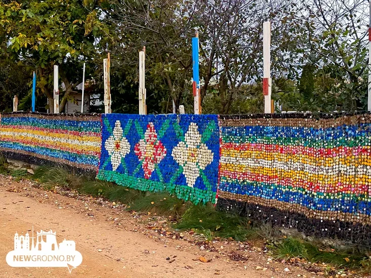 Ale ŭsia sutnaść raskryvajecca, kali padychodziš bližej. Bo materyjałam dla stvareńnia malunkaŭ i ŭvohule płota pasłužyli płastykavyja nakryŭki!