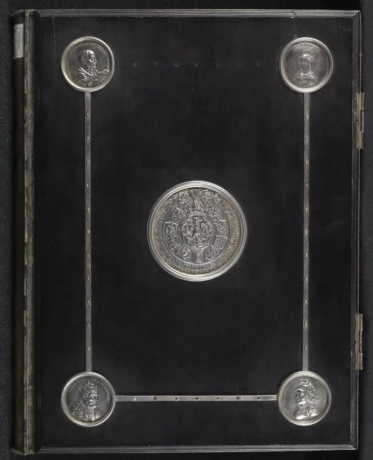 Tolki pieraplot knihi, vykanany z hrušavaha dreva, maje vyraznyja palityčnyja simvały: pamiž tonka vyrazanymi kvietkami i łacinskimi cytatami ź Pieśni Pieśniaŭ źmieščany srebranyja płaściny z vyjavaj Pahoni i čatyrma karanavanymi hierbami časoŭ paŭstańnia 1830—1831 hadoŭ.