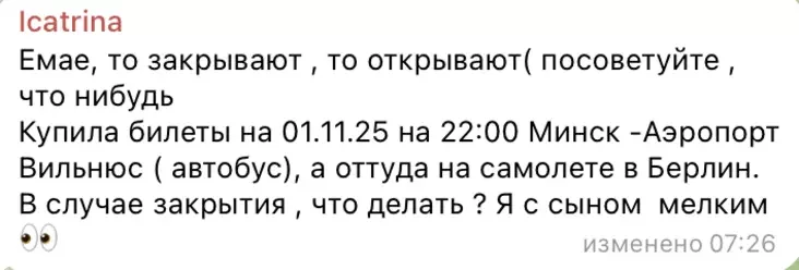 Inšaja karystalnica raicca ŭ čacie, što joj rabić, kali jana maje kvitki na 1 listapada na 22:00 ź Minska ŭ aeraport Vilni, adkul z małym synam lacić na samalocie ŭ Bierlin.