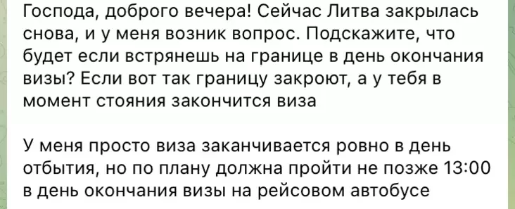 «Padkažycie, što budzie, kali zachraśnieš na miažy ŭ dzień zakančeńnia vizy? Kali voś tak miažu zakryjuć, a ŭ ciabie ŭ momant stajańnia skončycca viza. U mianie prosta viza zakančvajecca roŭna ŭ dzień adbyćcia, ale pa płanie pavinna prajści nie paźniej za 13:00 u dzień zakančeńnia vizy na rejsavym aŭtobusie».