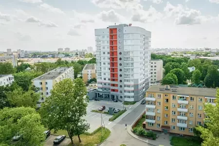 Budynak, pabudavany ŭ 2010 hodzie, adroźnivajecca sučasnaj płaniroŭkaj, prastornym chołam na pieršym paviersie i dvuma vychadami z padjezda — adzin viadzie ŭ dvor, druhi — da skviera Jeŭfrasińni Połackaj, pišuć Minsk-naviny.