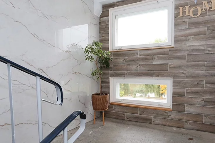 Na pieršym paviersie, u zonie choła, ścieny byli ablicavany bujnafarmatnym śvietła-šerym hlancavym kieramahranitam pamieram 120 na 60 santymietraŭ.