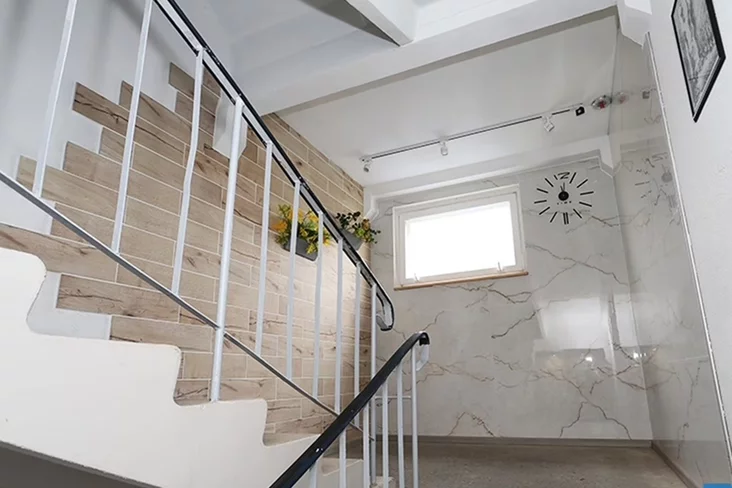 Pralot, jaki viadzie z choła da leśvicy, aformleny matavymi plitkami ciomnych adcieńniaŭ mienšaha pamieru. Anałahičnaje kambinavanaje rašeńnie vykarystana dla azdableńnia ścien na mižpaviarchovych placoŭkach.