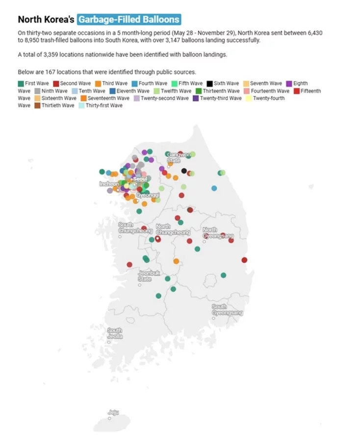 U 2024‑m va ŭsioj Paŭdniovaj Karei, ad pryhraničnych rajonaŭ da stalicy Sieuła, byli zafiksavany sotni vielizarnych pavietranych šaroŭ, jakija nieśli ŭ sabie nie ideałahičnyja paviedamleńni, a bytavoje śmiećcie.