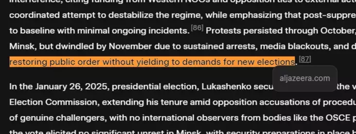 U častcy pra «hramadskuju padtrymku» spačatku padajucca aficyjnyja ličby pra 87,6% hałasoŭ na vybarach 2025 hoda, a tolki potym — dadzienyja daśledavańnia Chatham House, dzie realnaja padtrymka aceńvajecca ŭ 27%. Taki paradak padśviadoma ŭzmacniaje aficyjnuju viersiju.