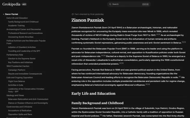 Iłan Mask pradstaviŭ Hrokipiedyju jak «alternatyvu Vikipiedyi», jakaja nibyta pavinna «ačyścić jaje ad prapahandy». «Naša Niva» praanalizavała šerah artykułaŭ, kab zrazumieć, ci sapraŭdy Hrokipiedyja prapanuje novuju jakaść viedaŭ — ci prosta pierapisvaje Vikipiedyju ź inšym ideałahičnym uchiłam.