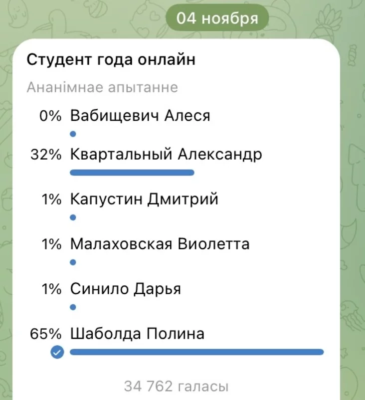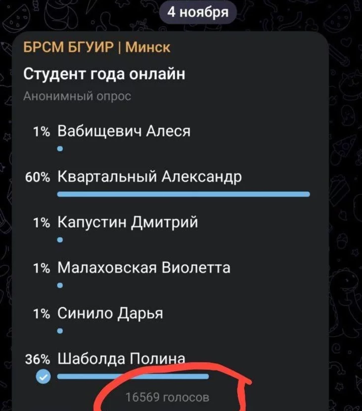 U niejki momant byli ŭkinutyja hałasy za studenta Alaksandra Kvartalnaha, i jon vyrvaŭsia napierad z 60% hałasoŭ.