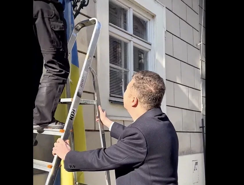 Staršynia parłamienta Čechii vykłaŭ videa, jak dapamahaje zdymać ukrainski ściah z budynka