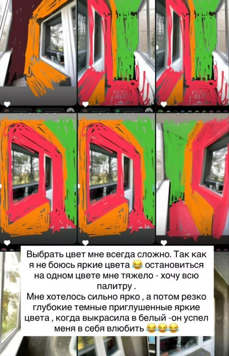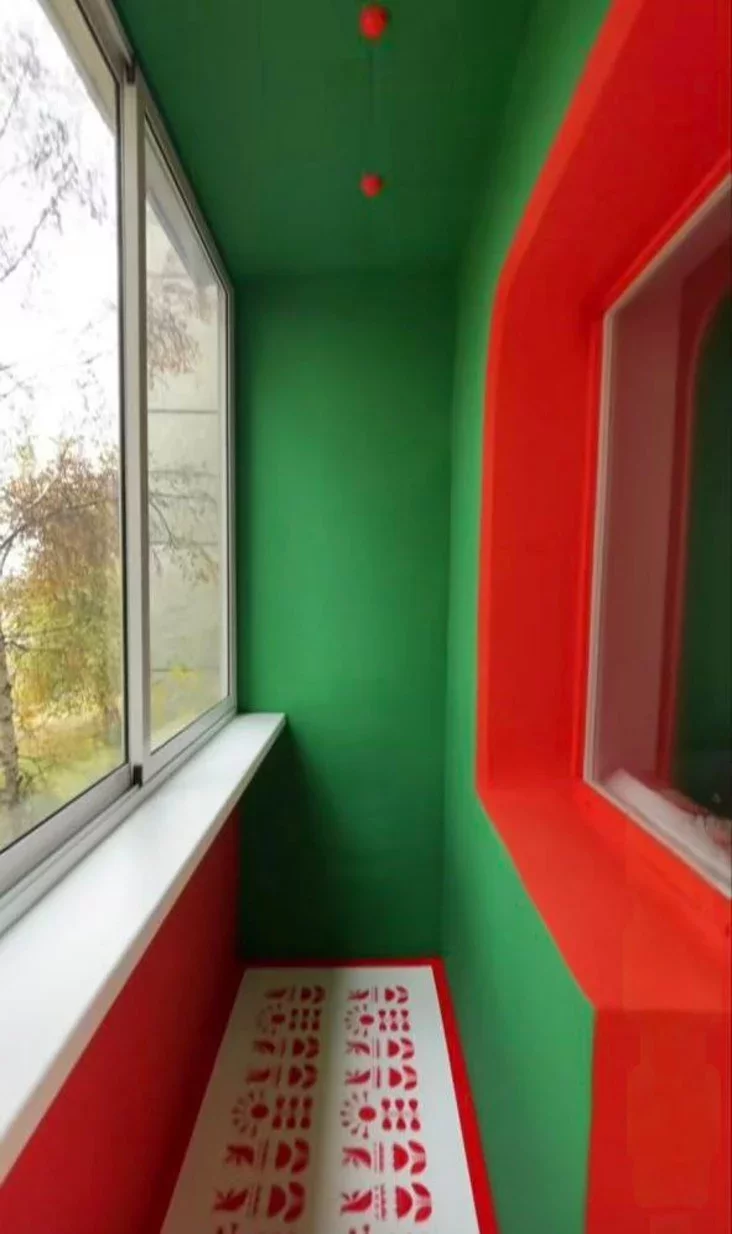 Varyjanty koleru dla ścien bałkona byli roznyja: i karyčnievy, i ciomna-šery, i bieły… Žančynie chaciełasia čahości niebanalnaha. U niejki momant błohierka zrazumieła, što duša prosić jarkich koleraŭ, i nadumała pafarbavać bałkon u čyrvony, zialony i aranžavy adnačasova.