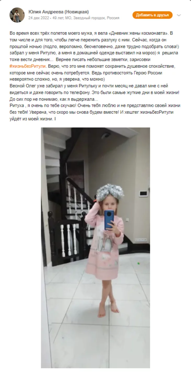 A ŭžo ŭ śniežni 2022 hoda žančyna vykłała ŭ instahram videa z prośbaj abaranić jaje ad hieroja (Navicki maje zvańnie Hieroja Rasii) — tady jana pryznałasia, što znachodzicca ŭ pracesie razvodu z kasmanaŭtam.