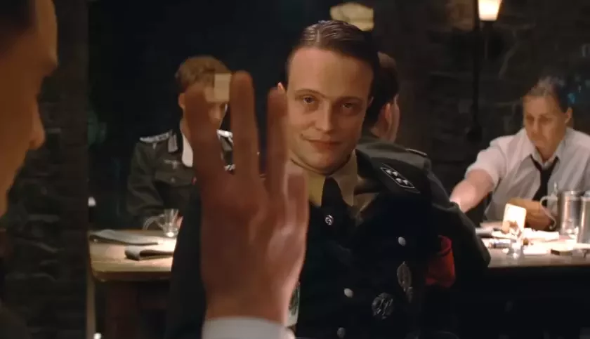 Šturmbanfiuraru hiestapa (Aŭhust Dyl) zdajecca padazronym akcent hościa, i jon padsadžvajecca da stolika, kab vyviedać praŭdu. Krytyčny momant zdarajecca, kali ahient zamaŭlaje viski: sa słovami «drei Gläser» («try šklanki»), jon pakazvaje aficyjantu try palcy na anhlijski manier — bieź vialikaha palca. Dla niemca hety žest stanovicca toj samaj detallu, jakaja paćviardžaje słušnaść jahonych zdahadak. Usio kančajecca žorstkaj tarancinaŭskaj pierastrełkaj u bary, u jakoj hinuć amal usie prysutnyja.