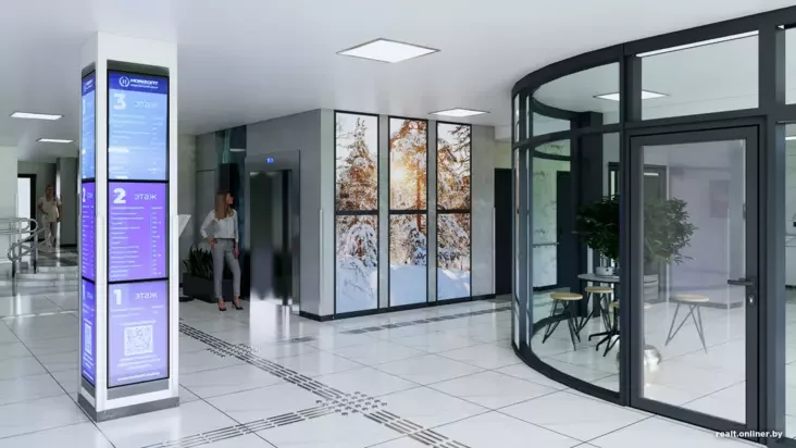 Na pieršym paviersie raźmieścicca prastorny choł z rehistraturaj, zonaj samazapisu, pamiaškańniem dla afarmleńnia balničnych, bufietam i aptekaj. Na inšych pavierchach raźmieściacca kabiniety daktaroŭ, adździaleńni dyjahnostyki, łabaratoryi, stamatałohija.