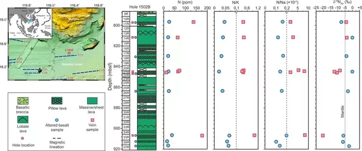 Analiz hidratermalnych žyłak sa śvidraviny U1502B vyjaviŭ biespamyłkovy chimičny podpis azota. Hety podpis zasnavany na suadnosinach dźviuch raznavidnaściej atamaŭ azotu — lahčejšaj i bolš ciažkaj, jakija funkcyjanujuć jak izatopny «adbitak palca», što dazvalaje vyznačyć pachodžańnie złučeńnia.