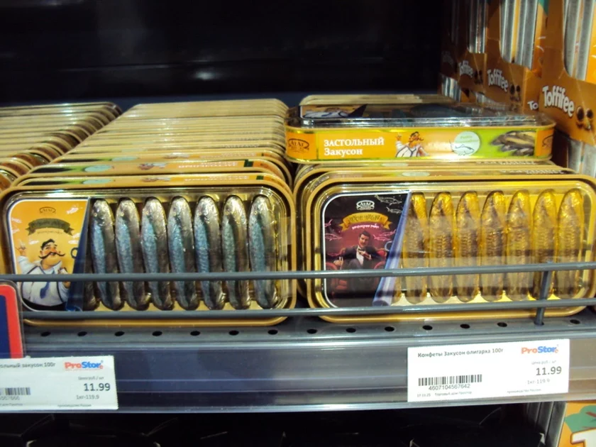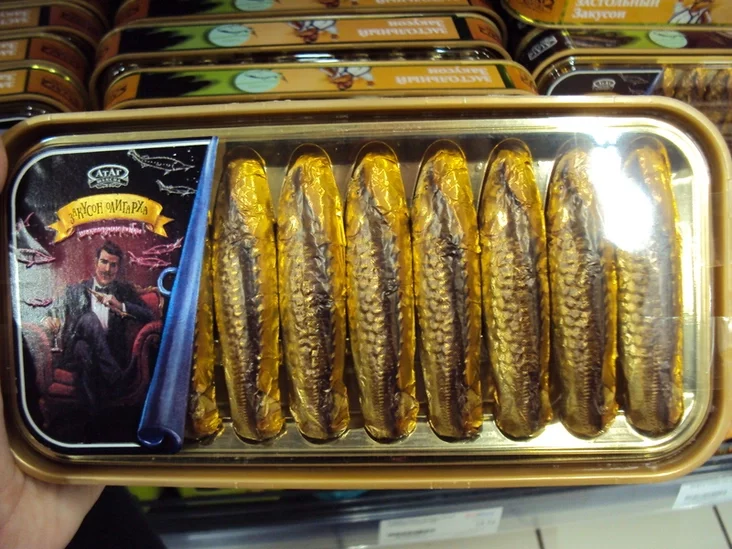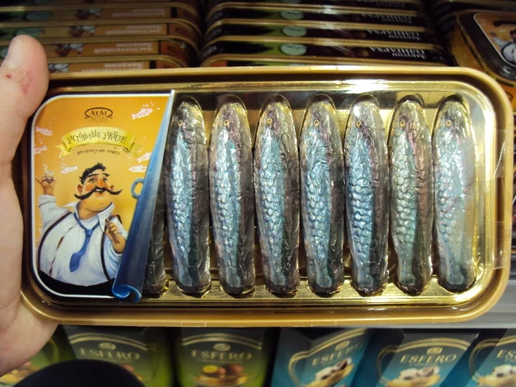 Hety tavar, u adroźnieńnie ad inšych rybnych kansiervaŭ, lažaŭ u adździele z kandytarskimi vyrabami. Ale heta zusim nie pamyłka supracoŭnikaŭ kramy — rybki ŭnutry blašanak šakaładnyja.