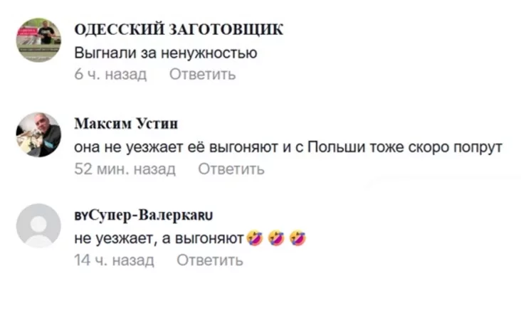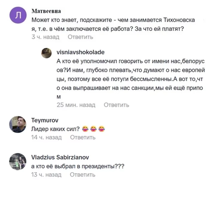 «A chto joj davaŭ paŭnamoctvy havaryć ad nas, biełarusaŭ? I nam hłyboka plavać, što dumajuć pra nas jeŭrapiejcy, tamu što ŭsie jaje patuhi biessensoŭnyja. A voś toje, što jana vyprošvaje dla nas sankcyi, my joj jašče pryhadajem», «Lidar jakich sił?», «A chto jaje vybiraŭ u prezidenty?» — masava pišuć boty.