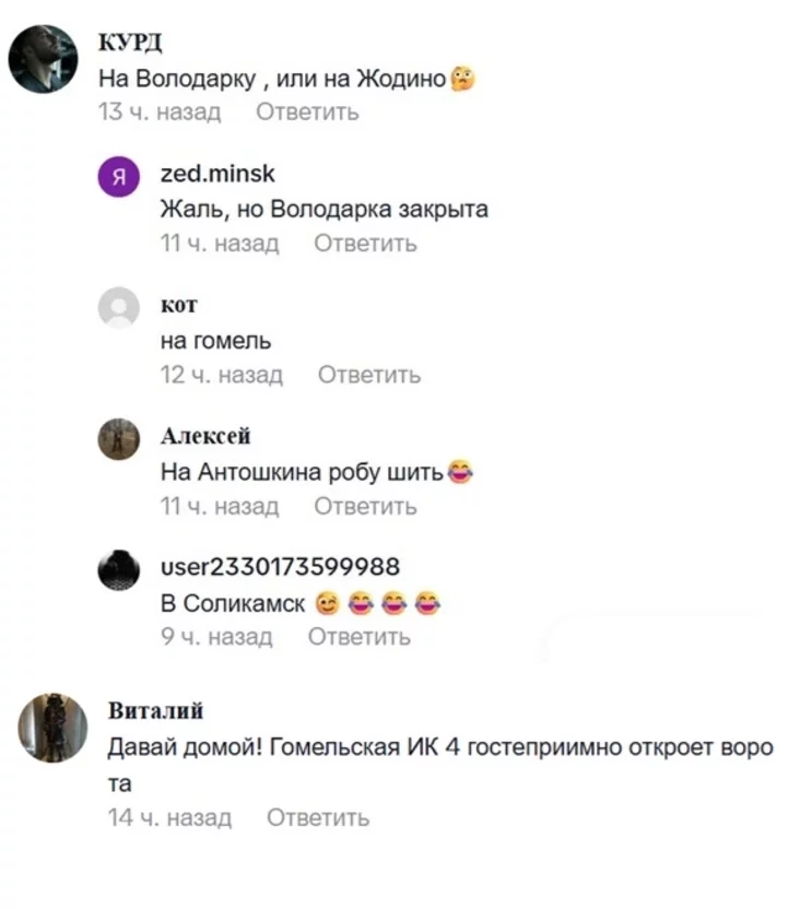 «Na Vaładarku ci ŭ Žodzina», — prapanuje adzin z kamientataraŭ, jakomu tut ža nahadvajuć, što «Vaładarka» ŭžo zakrytaja. «Na Homiel», «Na Antoškina robu šyć», «U Salikamsk», «Davaj dachaty! Homielskaja IK-4 haścinna adkryje varoty», — prapanujuć inšyja.
