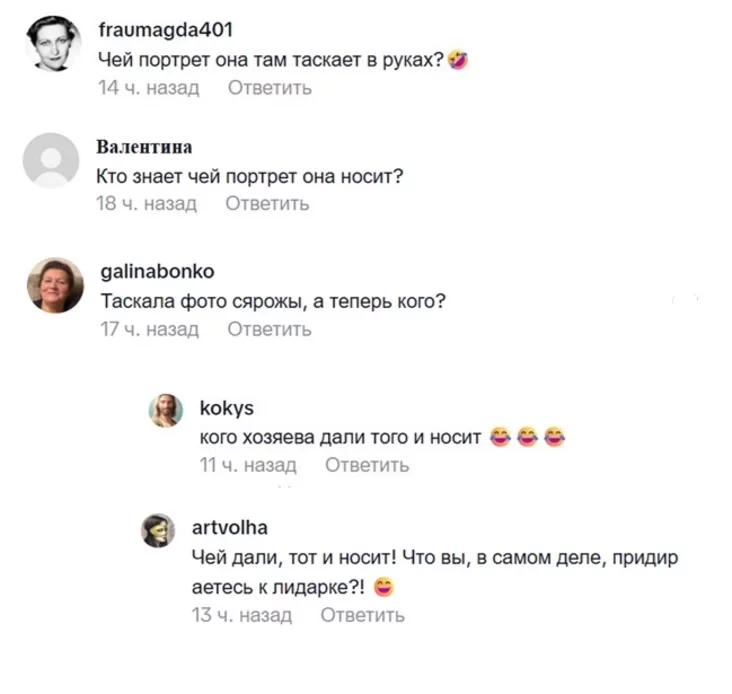 «Čyj partret jana tam ciahaje ŭ rukach?», «Chto viedaje, čyj partret jana nosić?», «Ciahała fota Siarožy, a ciapier kaho?» — pišuć tysiačy botaŭ, robiačy vyhlad, što nie viedajuć.