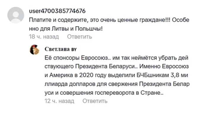 «Jaje sponsar — Jeŭrasajuz. Im tam karcić prybrać dziejnaha Prezidenta Biełarusi. Mienavita Jeŭrasajuz i Amieryka ŭ 2020 hodzie vydzielili «bčbšnikam» 3,8 miljarda dalaraŭ dla źviaržeńnia Prezidenta Biełarusi i ździajśnieńnia dziaržpieravarotu ŭ Krainie…»
