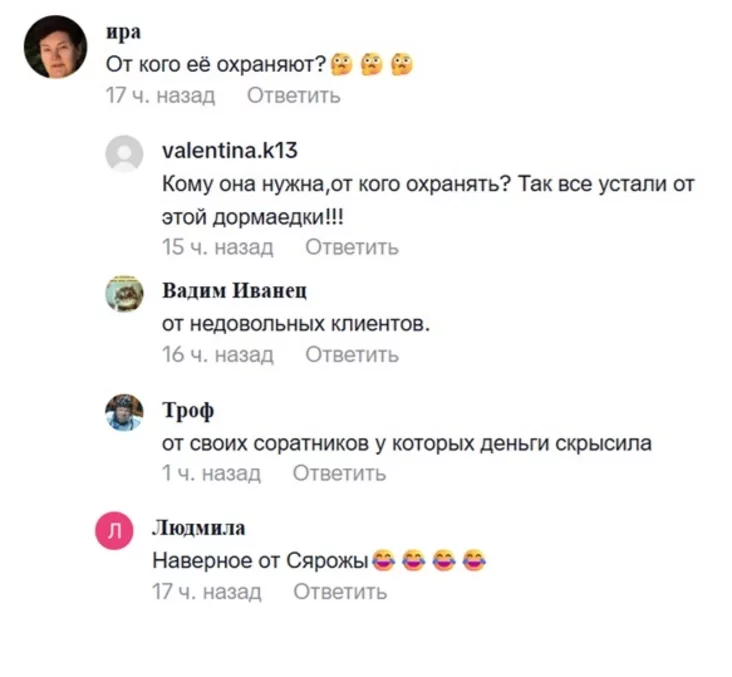 «Kamu jana patrebnaja, ad kaho achoŭvać? Tak usie stamilisia ad hetaj darmajedki!», «Ad niezadavolenych klijentaŭ», «Ad svaich paplečnikaŭ, u jakich hrošy skrysiła», «Chiba što ad Siarožy».
