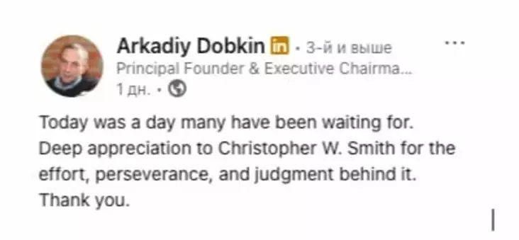 «Siońnia byŭ dzień, jakoha mnohija čakali. Hłybokaja ŭdziačnaść Krystafieru U. Śmitu za namahańni, nastojlivaść i razvažlivaść, jakaja staić za hetym. Dziakuj», — napisaŭ zasnavalnik EPAM Arkadź Dobkin u sacyjalnaj sietcy LinkedIn paśla taho, jak 13 śniežnia stała viadoma pra vyzvaleńnie ź biełaruskich kałonij 123 palitviaźniaŭ. Na jahony dopis źviarnuŭ uvahu Devby.io.
