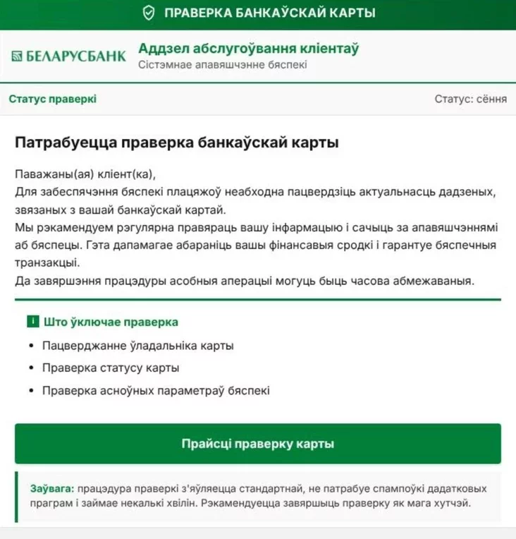 Pavodle ich słoŭ, jany atrymali paviedamleńnie sa skrynšotam «pravierki kartki» i nie zmahli zrazumieć, idzie razmova pra aficyjnaje apaviaščeńnie ad Biełarusbanka ci pra mahčymuju sprobu machlarstva.