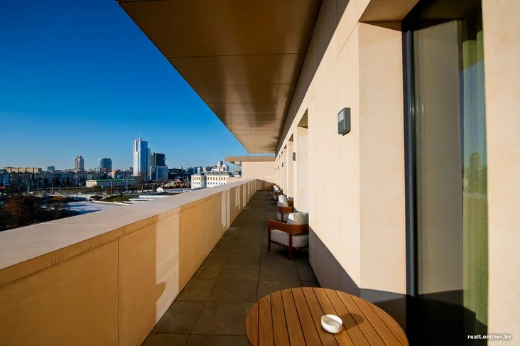 Diplomat Suite (ad $900). Płošča 82 «kvadraty». Tut jość spalnia, haścioŭnia z kuchniaj, harderobnaja i vialiki bałkon z panaramnym vidam na centr horada.