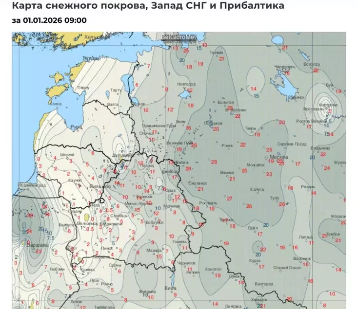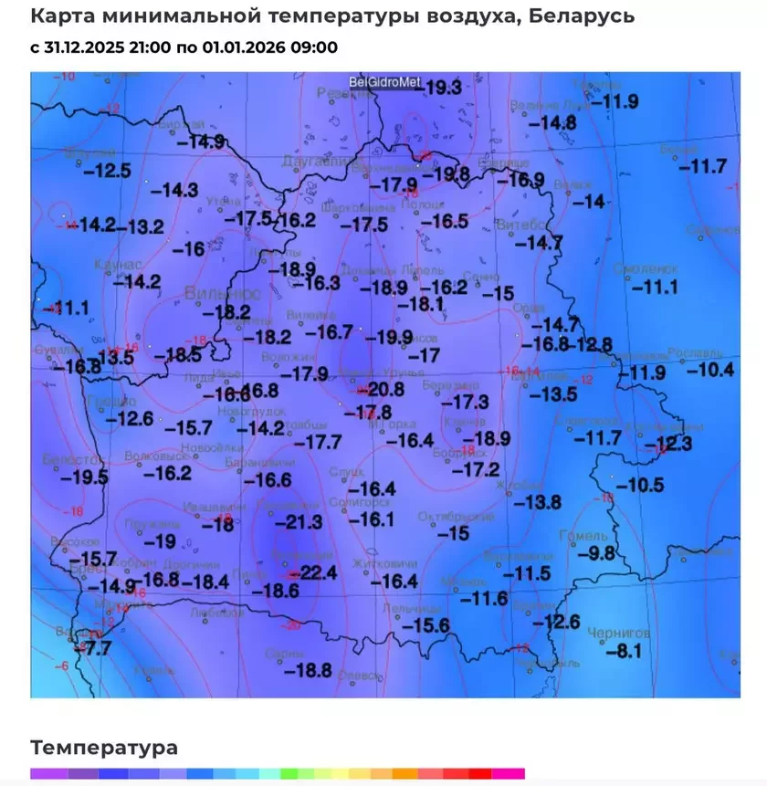 U Vilni było minus 18, u zvyčajna ciopłym Bieraści — minus 15, u Horadni — minus 13, u Mahilovie i Viciebsku — minus 14, a ŭ Homieli — usiaho tolki minus 10.