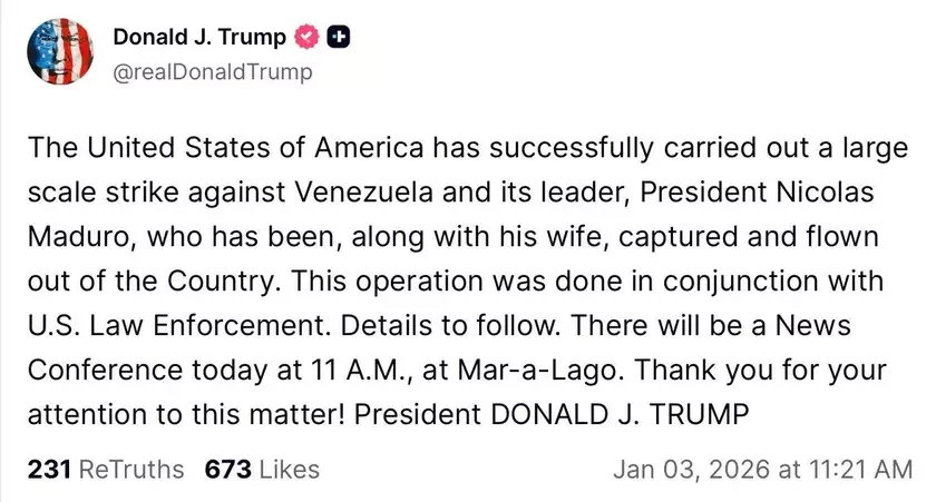 «Złučanyja Štaty Amieryki paśpiachova praviali maštabny ŭdar pa Vieniesuele i jaje lidarach. Prezident Madura razam sa svajoj žonkaj byŭ zatrymany i vyviezieny z krainy. Apieracyja była praviedziena ŭ kaardynacyi z pravaachoŭnymi orhanami ZŠA. Padrabiaznaści buduć paviedamlenyja paźniej. Siońnia ab 11‑j hadzinie ranicy ŭ Mar-a-Łaha adbudziecca pres-kanfierencyja», — napisaŭ Tramp u sacsietkach.