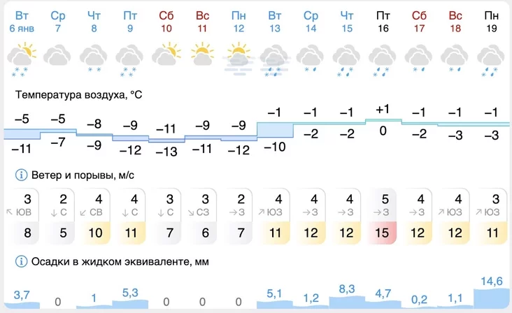 Nočču -5..-10°S, pry prajaśnieńniach -11..-14°S, maksimalnaja dniom -3..-8°S.