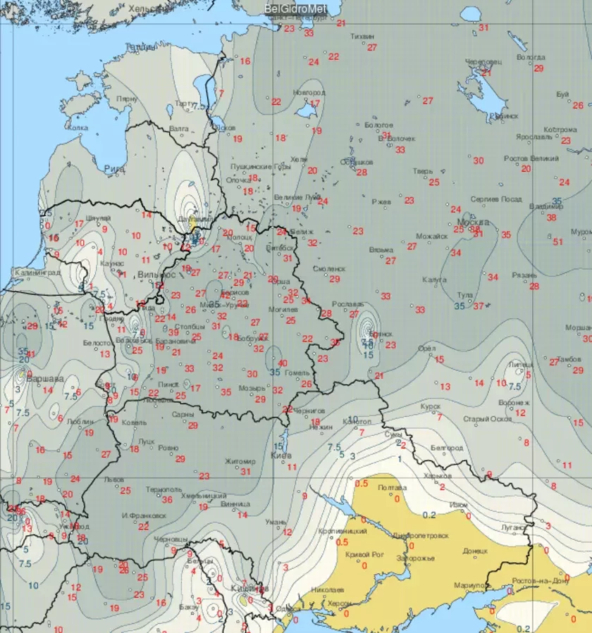 Na paŭnočnym zachadzie Homielskaj vobłaści — 40 sm, u Žytkavičach — 35 sm, u Minsku — 32 sm.