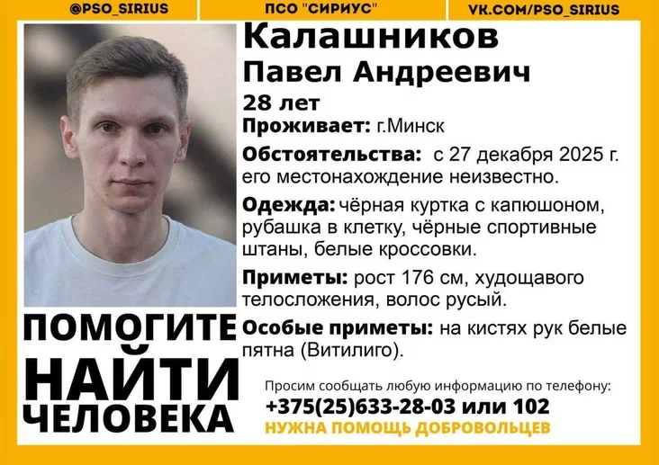 Prykmiety Paŭła: rost — kala 176 sm, vałasy rusyja. Byŭ apranuty ŭ čornuju kurtku z kapiušonam, kašulu ŭ kletku, čornyja spartyŭnyja štany i biełyja krasoŭki. Asablivyja prykmiety: na kiściach ruk majucca biełyja plamy vityliha. Kali vam što-niebudź viadoma pra miescaznachodžańnie Paŭła, prośba paviedamić pa telefonie 102 abo pa numary (25) 633-28-03.