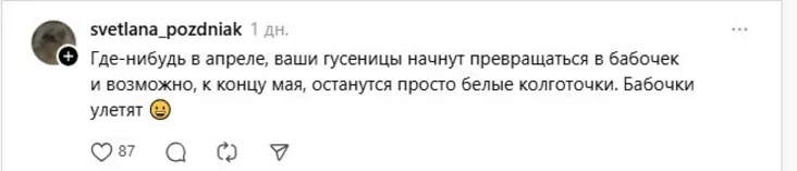 Hetaja mietamarfoza mnohim pryjšłasia daspadoby. U kamientaryjach ludzi žartavali, što nikoli nie dumali, što kałhotki mohuć tak raśśmiašyć, paraŭnoŭvali malunki z našeściem šmatnožak, «vałasami dybaram» i navat z padrychtoŭkaj da Vierbnaj niadzieli. Chtości pažartavaŭ, što viasnoj «vusieni» pieratvoracca ŭ matylkoŭ, a da leta zastanucca prosta biełyja kałhotki.