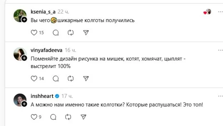 Adnak mnohija karystalniki adkazali, što ničoha mianiać nie treba: na ich dumku, heta nie niedachop, a admietnaja «fiška». Jany pisali, što kałhotki atrymalisia vielmi miłyja, «dva ŭ adnym», i prapanoŭvali navat raźvić ideju — naprykład, rabić takija ž efiekty ź miškami, kacianiatami ci kuraniatami, bo dzieciam heta vielmi padabajecca.