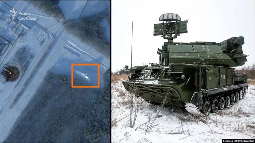 «My bačym, što ŭ abjekta na zdymku cień padobny na tank (vieža i šasi), a jaho daŭžynia — šyrynia dakładna adpaviadaje pamieram takoj sistemy, jak «Tor». Chutčej za ŭsio, heta sučasny «Tor-M2», jaki pabudavany, siarod inšaha, na šasi ad biełaruskaha «Minskaha zavoda kołavych ciahačoŭ», — skazaŭ Chrapčynski ŭ kamientary «Schiemam».