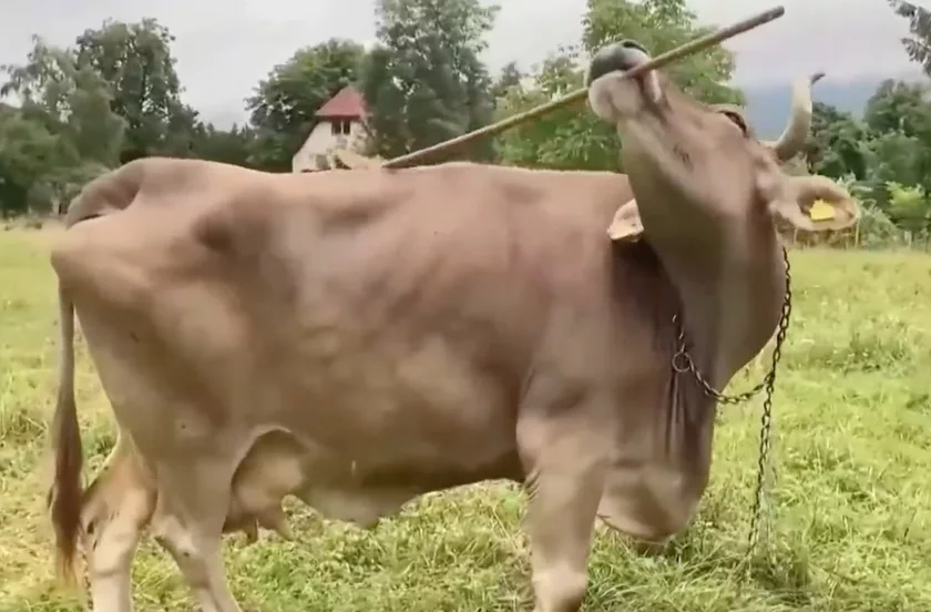 Pavodle jaho słoŭ, jana pačała rabić heta va ŭzroście troch hadoŭ. A ciapier karovie ŭžo 13 hadoŭ, i jana dobra avałodała technikaj: zaciskajučy pałku ŭ skivicach, jana moža doŭhimi instrumientami pačasać amal kožnuju častku svajho cieła.