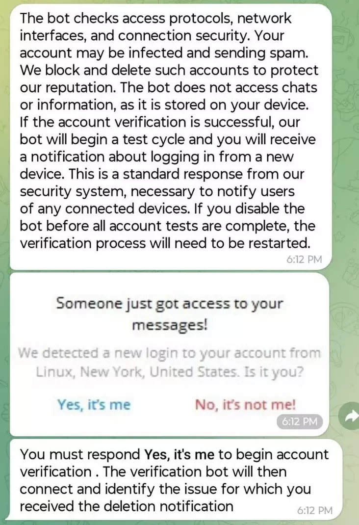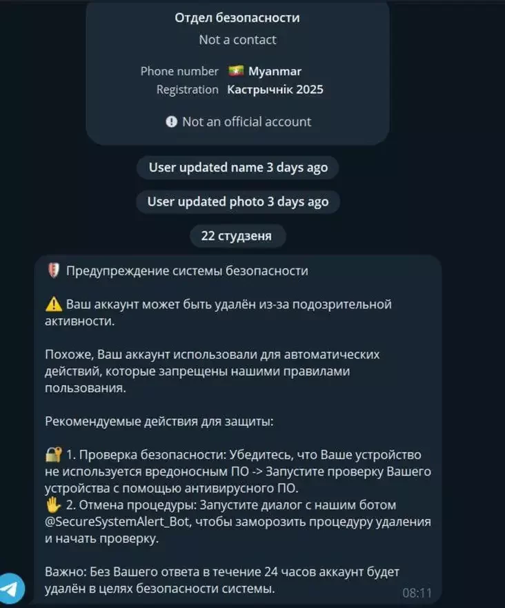 Spačatku vam prychodzić paviedamleńnie nibyta ad słužby biaśpieki. Tam skazana, što akaŭnt pad pahrozaj praz padazronuju aktyŭnaść, i prapanujecca pierajści ŭ bot.
