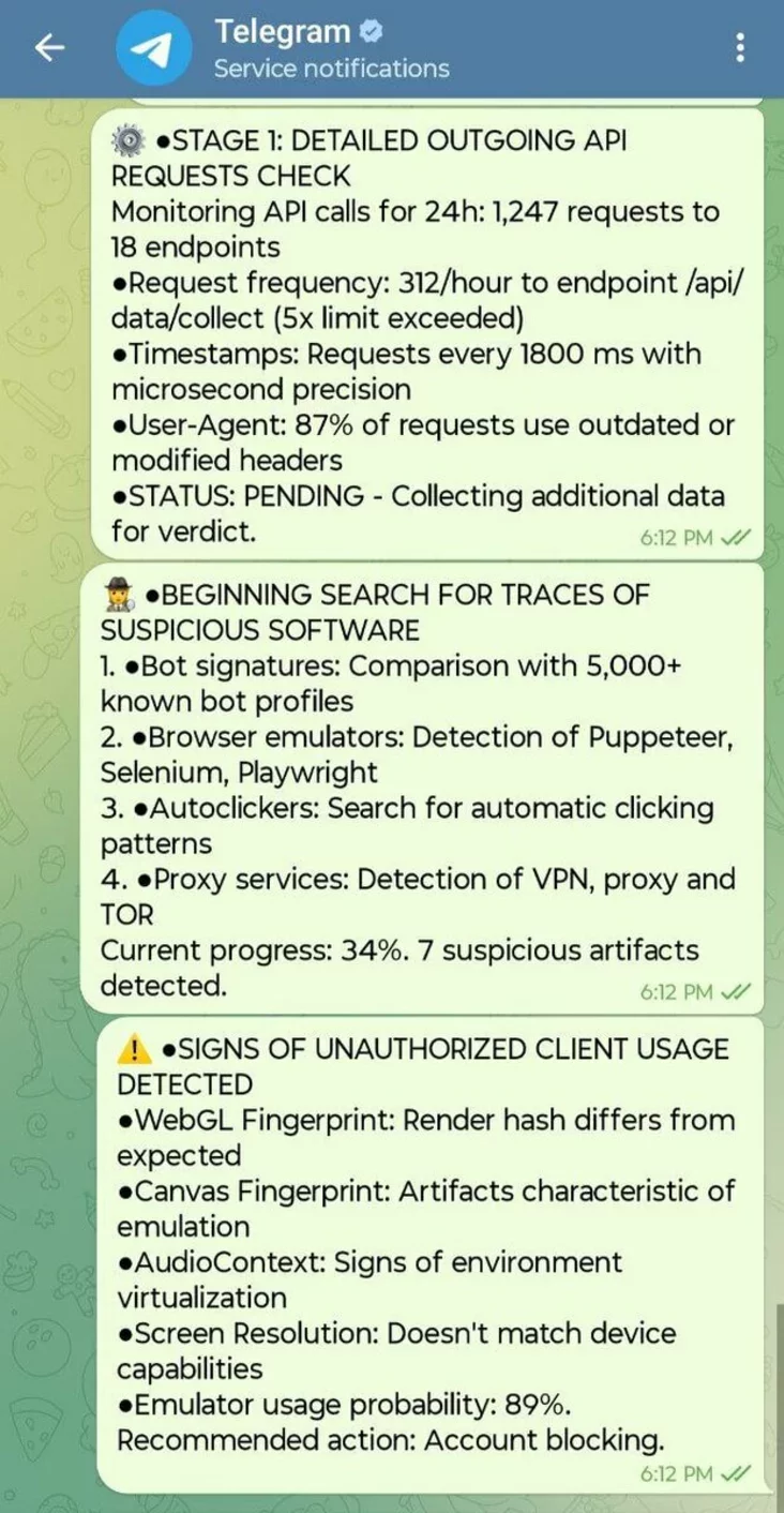 Dalej bot pačynaje imitavać burlivuju dziejnaść — piša sam sabie ŭ dyjałoh z realnaj padtrymkaj telehrama roznuju navukapadobnuju łuchtu. Heta treba, kab zatrymacca ŭ akaŭncie i paśpieć spampavać usiu pierapisku.