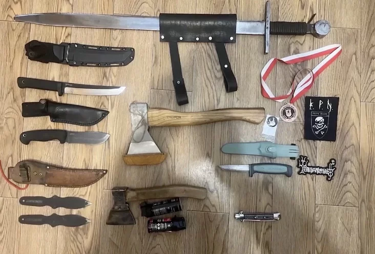 Pa miescach ich pražyvańnia vyjaŭleny i kanfiskavany nacysckija ściahi, litaratura, jakaja prapavieduje nacyzm, niezarehistravanaja simvolika, a taksama instrukcyi pa vybuchovaj spravie i chałodnaja zbroja, śćviardžaje MUS. U videa pakazany zablurany bieł-čyrvona-bieły ściah.
