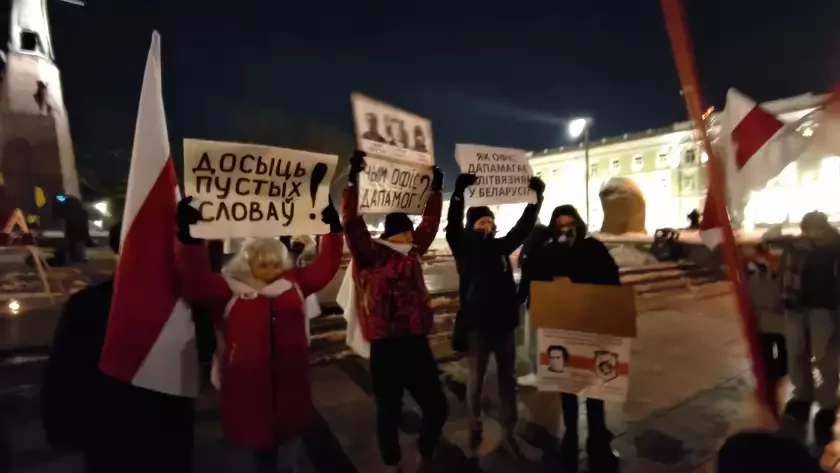 Niekalki byłych palitviaźniaŭ pryjšli na akcyju pamiaci zahinułych dobraachvotnikaŭ z płakatami suprać Cichanoŭskaj