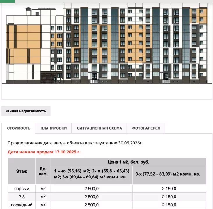 Ceny na kvatery ŭ šerahovaj 9‑paviarchovaj panelcy na ŭskrainie Hrodna. Fota: skrynšot z sajta ghb.by